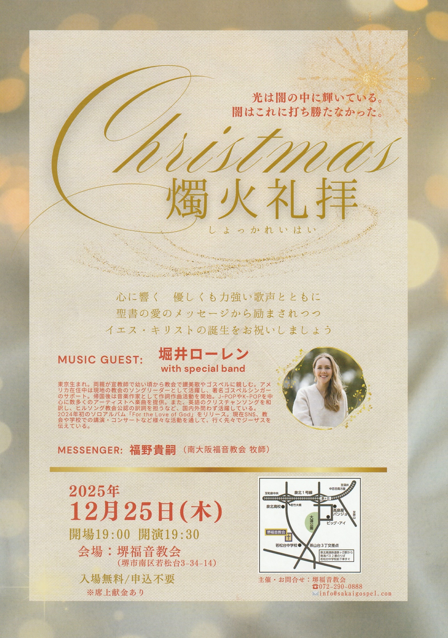 今年の燭火礼拝は賛美ゲストに堀井ローレンさん、メッセンジャーに福野貴嗣師をお迎えしてイエス・キリストの生誕をお祝いします。あなたも是非、燭火礼拝にお越しください。